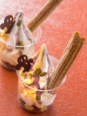 お馴染みのクリッターサンデーのハロウィーンバージョンが今年も登場。パンプキン×ミルクのソフトクリームはシナモン味のミッキーチュロスですくって食べてみて。
