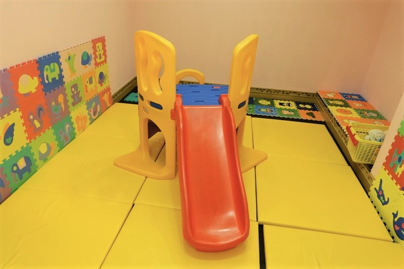 こちらの部屋は、ちょっと小さめの滑り台、おままごとセット、ブロック、ジェンガ、本などがあり、赤ちゃんでも遊べそうですね。