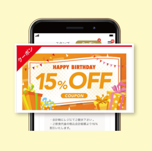 - クーポンは誕生日月に自動配布され、会計時に提示するだけで簡単に使える