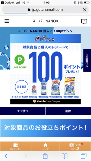 対象商品のレシートでLINE POINT 100ポイントがもらえるクーポンが当たりました!
