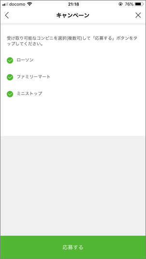 受け取りやすいコンビニを選択し[応募する]をタップします。