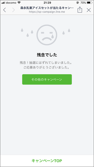 | 抽選 | キャンペーンページの「応募する」ボタンをタップすると、