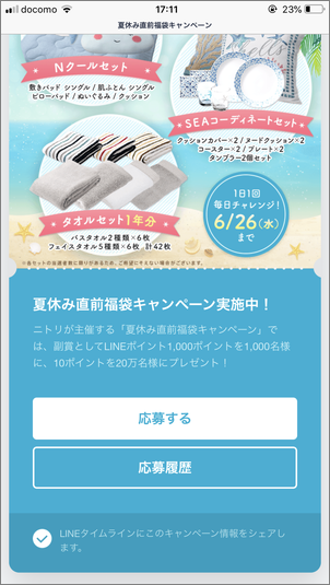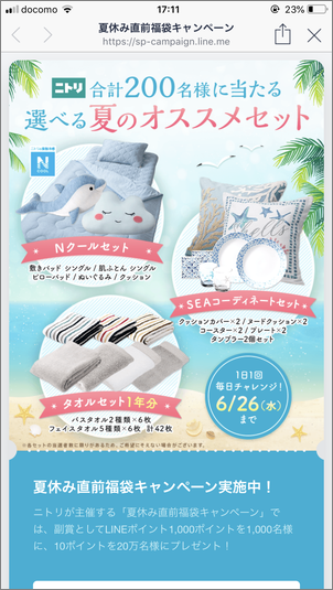 | キャンペーン | 抽選により最大200名様に「ニトリの選べる夏のオススメセット」または「LINEポイント」が当たるキャンペーンです。