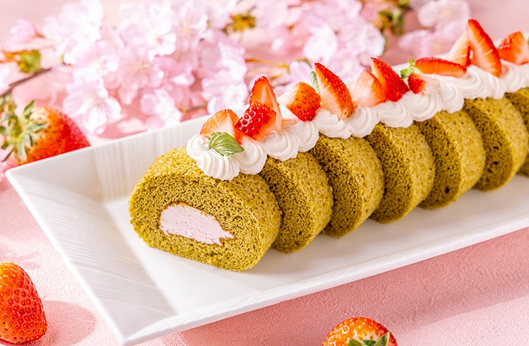 桜クリームを桜の葉パウダーを使用したふわふわ生地で巻き、生クリームと苺をトッピングしました。