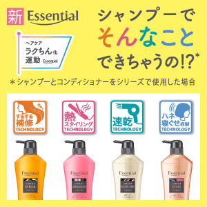 | キャンペーン | エッセンシャル スマートリペア / スマートアレンジ / スマートブロードライ / スマートスタイル いずれか1セット (シャンプーとコンディショナー ポンプ 各480ml)が抽選で5,000名様に当たる